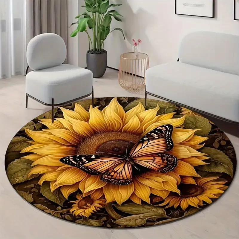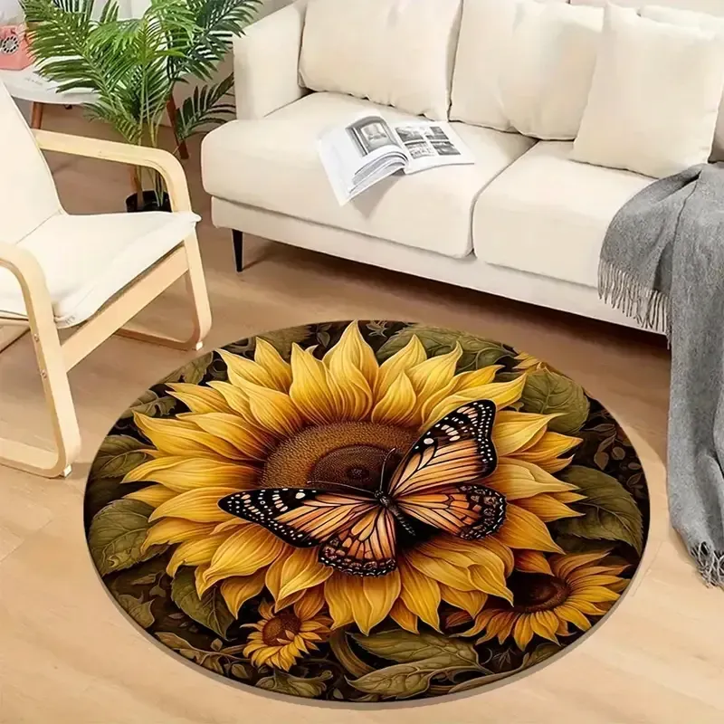 Tapis rond antidérapant avec un design de papillon et de tournesol.